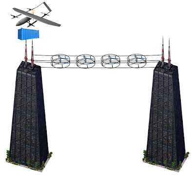 The facilities would be built as twin towers. Vertical wind turbines would be mounted on the suspension bridge formed between the two towers. The roof of the towers will double as the aerial logistic gates of the facility. Electrically operating drones will carry the raw materials to the facility and take away the manufactured goods. In the meanwhile, they will charge themselves from the sustainable electric supply. The facility will have dual elevator system, one carrying the raw materials and the other finished goods, that counterbalances each other to minimize the power consumption. The vertical wind turbines will have slightly different geometries to alter their sound signatures to minimize the accumulation of noise.
